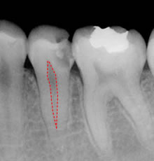 初診時のレントゲン。歯の真ん中にある空間に神経が入っています